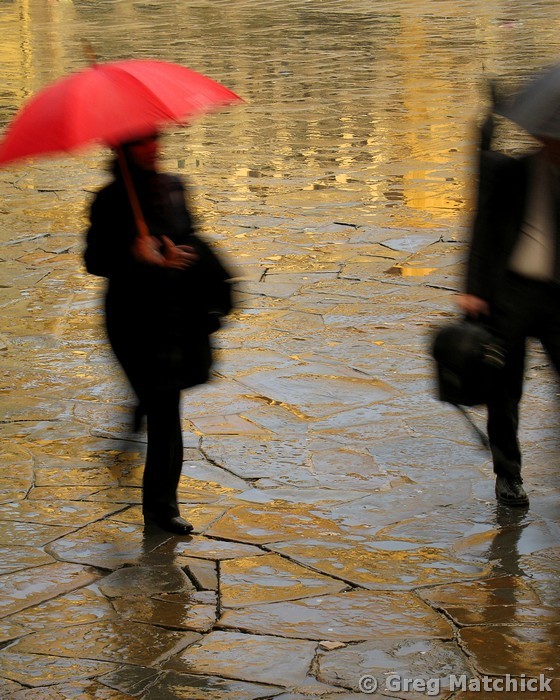 This image was created from a combination of planning and pure serendipity. Although I set up my tripod and composed the stones and reflections in the Piazza Della Signoria, I was hoping for a bicycle to streak through the frame. Instead, this woman with the red umbrella appeared and walked into the scene. I had only seconds and timing was crucial. This photograph was taken during my second visit to Florence in 2005.